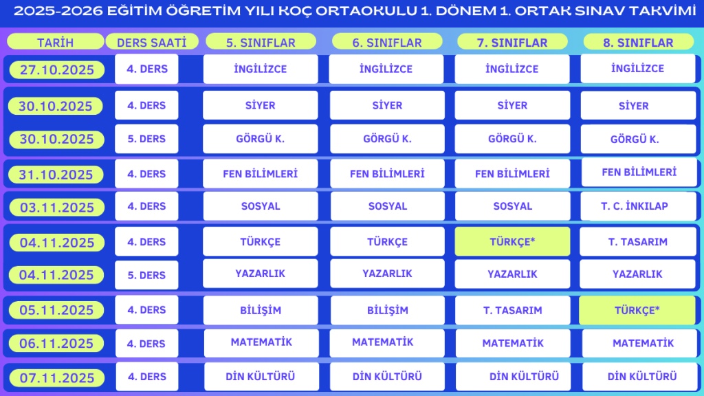 2025-2026 EĞİTİM ÖĞRETİM YILI BİRİNCİ DÖNEM BİRİNCİ ORTAK SINAV TAKVİMİ